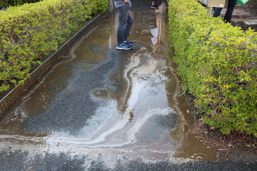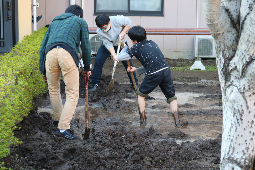 雨上がりの夕方に、こばと寮の職員と子どもが泥水を書き出していました。