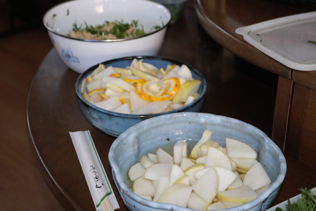 事務所の玄関に大根や白菜
