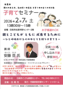 2月7日(土)13時半~15時まで子育てセミナーを開催いたします。 お問い合わせは日高市こども家庭センターTEL042-989-2111まで。 皆様のご参加お待ちしております。